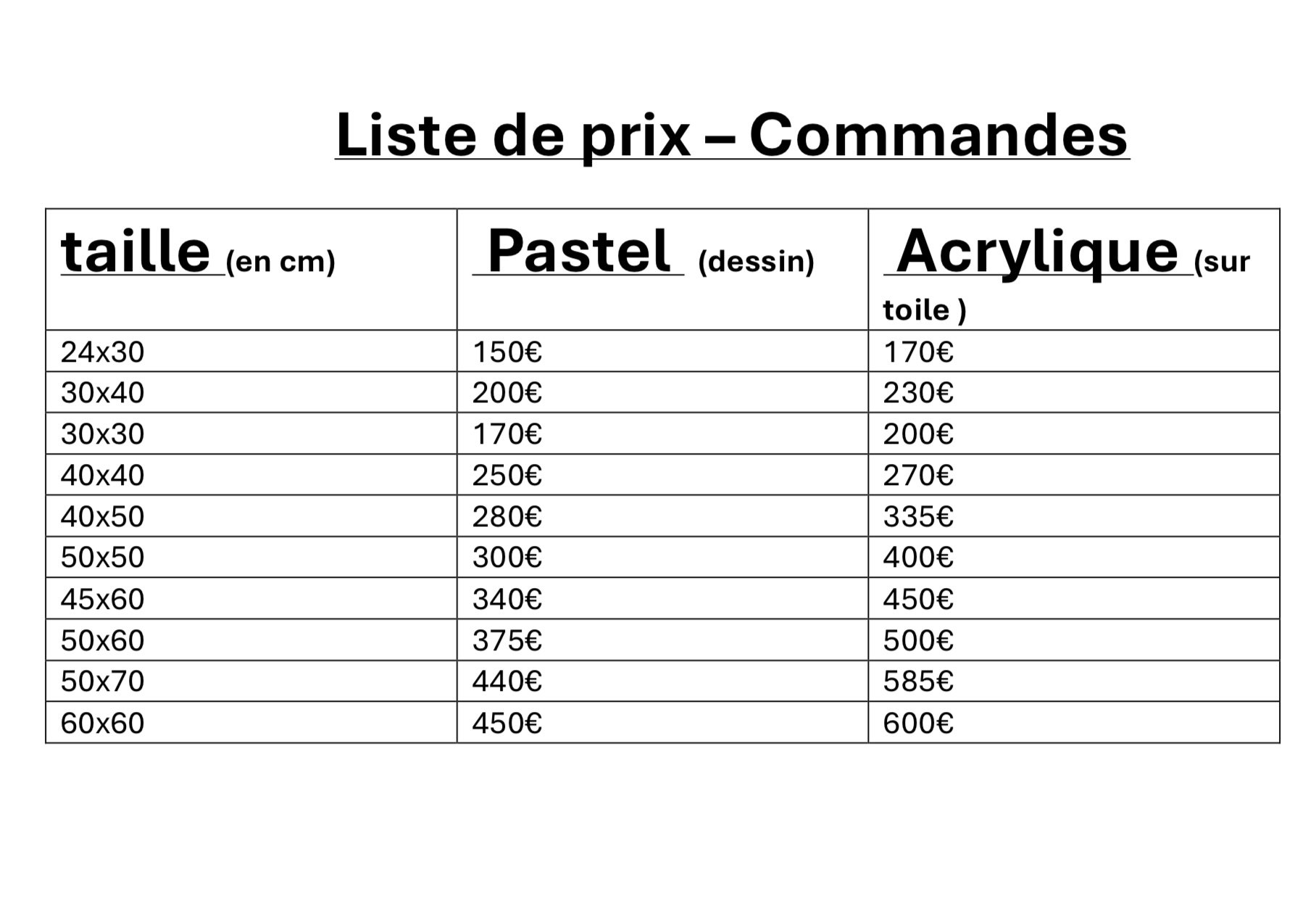 Je propose des tailles standards faciles à encadrer. Le choix de taille le plus populaire au pastel est 30x40. Tandis qu’à l’huile, c’est le format 40x50 qui est le plus choisi. Evidemment, le format que vous choisirez dépendra de la place dont vous disposez, du budget et de vos préférences personnelles.